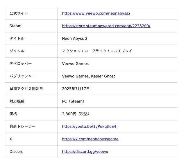 今後の大型アップデートや家庭用ゲーム版のリリース予定などの最新情報をチェックするために、公式サイト www.veewo.com/neonabyss2 をご覧いただき、公式Xアカウントをフォロー、公式Veewo Discordにご参加ください!