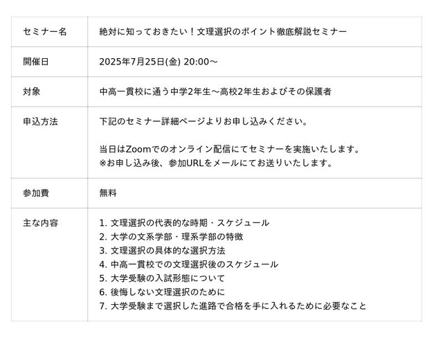 本セミナーはオンラインかつ参加費無料ですので、現在まさに文理選択の時期が迫っている方や、将来に向けてそろそろ文理選択について考え始めている方は、以下の詳細ページよりお気軽にご参加ください。