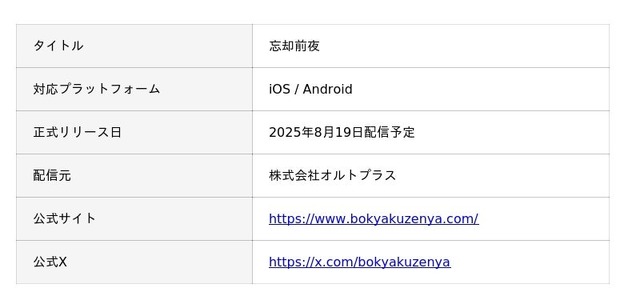 株式会社オルトプラス(本社:東京都豊島区、代表取締役:石井武、以下「オルトプラス」)は、新作カードRPGスマートフォン向けタイトル『忘却前夜』(以下「本作」)の正式リリースを、今夏2025年8月19日(火)に決定したことをお知らせいたします。