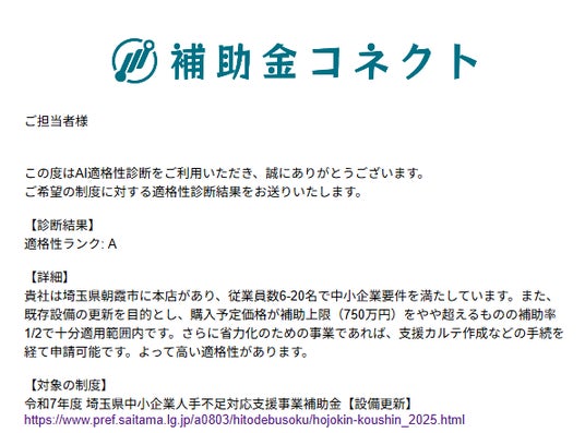 補助金コネクト株式会社(本社:東京都渋谷区、代表取締役:岩井康一)は、2025年7月24日、生成AIを用いて特定補助金の申請要件への適合度を最短30秒でセルフチェックできる新機能「AI適格性診断」をリリースしました。