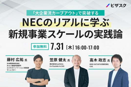 「知見と、挑戦をつなぐ」をミッションにグローバルなナレッジプラットフォームを運営する株式会社ビザスク(以下、当社)は、「NECのリアルに学ぶ、新規事業スケールの実践論」をテーマに、日本電気株式会社 みらい価値共創部門 ビジネスイノベーション統括部 ディレクター 藤村 広祐 氏、株式会社hootfolio Co-Founder & CEO 笠原 健太 氏、BIRD INITIATIVE株式会社 CSO 高木 政志 氏の3名様ご登壇による無料オンラインセミナーを 7/31 (木) 16:00 より開催します。
