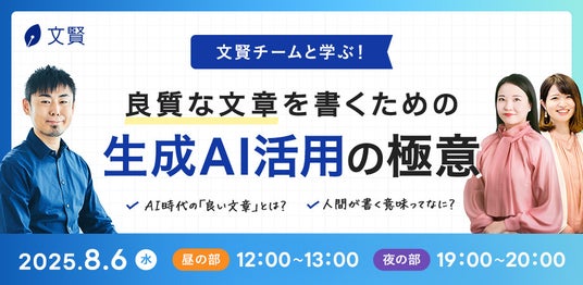 株式会社ウェブライダー(本社:京都市中京区、代表取締役:松尾茂起)は、2025年8月6日(水)に、生成AIを活用した文章作成の実践的なノウハウを解説する無料オンラインセミナー「文賢チームと学ぶ!良質な文章を書くための生成AI活用の極意」を開催いたします。