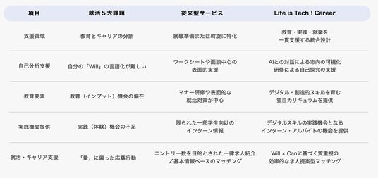 ■ 就活の5大課題における従来サービスと「Life is Tech ! Career」の比較