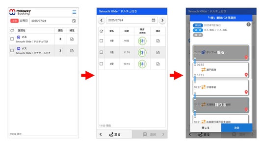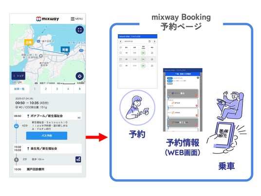 今回の「SETOUCHI GLIDE」の実証実験に関して、予約に必要な一連の機能が用意されており実証実験などのスモールスタートでも利用が可能な「mixway Booking」を採用いただきました。関連施設などのWebサイトから「mixway Booking」にアクセスすることで、Web上で座席の事前予約が簡単にできるようになり、地域の方々や観光で訪れる方々の利便性を向上します。