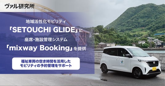 経路検索サービス「駅すぱあと」を提供する株式会社ヴァル研究所(本社:東京都杉並区、代表取締役:菊池 宗史)は、社会福祉法人 新生福祉会の運営する地域活性化モビリティ「SETOUCHI GLIDE(せとうちグライド)」の予約システムとして、座席・施設管理システム「mixway Booking(ミクスウェイブッキング)」を採用されましたことをお知らせします。さらに、複合経路検索「mixway(ミクスウェイ)」と「SETOUCHI GLIDE」の連携を開始します。