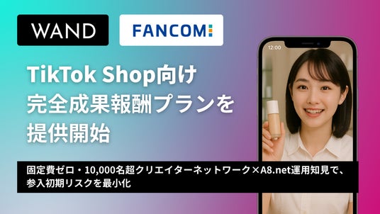 成果報酬型インフルエンサーマーケティングサービス「NOX」を始めとするフルファネル型ソーシャルメディアマーケティング支援を提供する株式会社WAND(本社:東京都渋谷区、代表取締役社長:黒崎 悠一∕以下、WAND)は、この度、親会社である株式会社ファンコミュニケーションズ(本社:東京都渋谷区、代表取締役社長:⼆宮幸司、東証プライム市場:2461、以下「ファンコミュニケーションズ」)の国内最大級アフィリエイトASP「A8.net(エーハチネット)」で培った成果報酬型広告の知見を活かし、TikTok Shopに特化した 「完全成果報酬プラン」 を提供開始しました。