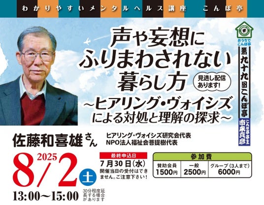 しばらくお休みしていたこんぼ亭月例会、8月より再開です。今回のテーマは、「ヒアリング・ヴォイシズ」です!オンライン開催(見逃し配信あり)です。みなさまぜひご参加ください。