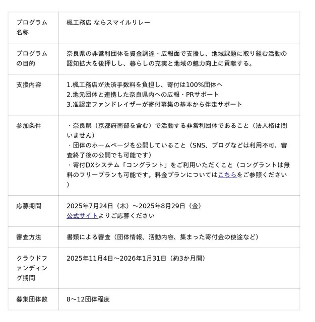 ソーシャルセクターと企業向けに「寄付DXシステム」を提供するコングラント株式会社(本社:大阪市西区、代表取締役:佐藤正隆)は、奈良・京都南部を中心に住宅事業「楓工務店」や不動産事業「トチナラ」などを展開するアイニコグループ株式会社(本社:奈良県奈良市、代表者:田尻 忠義)と連携し、奈良県で活動する非営利団体を応援する企業支援型クラウドファンディング「楓工務店 ならスマイルリレー」を実施いたします。