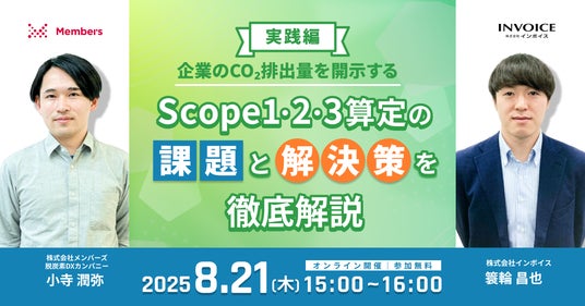 株式会社インボイス(本社:東京都千代田区、代表取締役社長:加茂正巳)は、デジタル技術と炭素知識を掛け合わせた人材とソリューションを提供し、企業の脱炭素経営を「はかる」「減らす」「稼ぐ」の3軸を中心に設計から運用支援まで包括的に提供する、株式会社メンバーズ(本社:東京都中央区、代表取締役社長:高野明彦)の脱炭素DXカンパニー(東京都中央区、カンパニー社長 西澤直樹)と、GHG排出量Scope1・2・3算定課題とその解決方法について、共催ウェブセミナーを開催しますのでお知らせします。