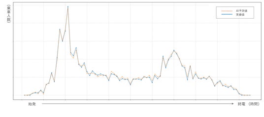 本サービスでは前述のAIモデルを用い、列車の乗車人数に応じて混雑度を5段階(1:空席あり、2:ゆったり立てる、3:やや混雑、4:混雑、5:大変混雑)で表示します。AIモデルの検証は、駅毎に次の駅までの乗車人数についてAI予測値を算出し、実績値と比較します。7月中旬に実施した検証では、下記図表で示すとおり、AIの予測値(図表:オレンジ線)と実績値(図表:青線)が同じ傾向を示す結果が得られました。