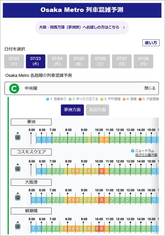 ※7月31日(木)に、8月1日(金)から8月7日(木)までの混雑予測情報を配信し、その後毎日更新されます。詳しくはOsaka Metroの発表内容をご確認ください。