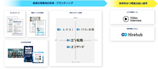プレスリリースや特設ページ、Web広告での告知に加え、各求人サイトでの集客支援を実施。『ミドルの転職』『AMBI』『エン転職』『エンゲージ』とターゲットの異なる求人サイトを活用することで、ターゲットへ網羅的に求人を届けます。さらに、ビデオ面接ツール『Video Interview』、採用管理システム『Hirehub』の提供により、選考フローを支援。求職者との適切なマッチングをサポートします。