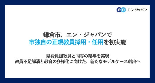 エン・ジャパンは『ミドルの転職』『AMBI』『エン転職』『エンゲージ』といった求人サービスを通じた集客支援に加え、ビデオ面接ツール『Video Interview』、採用管理システム『Hirehub』の提供により、選考フローを支援。求職者との適切なマッチングをサポートします。本制度が新しい教員採用のモデルケースとなることを目指し、鎌倉市とともに制度の認知と応募促進を支援してまいります。