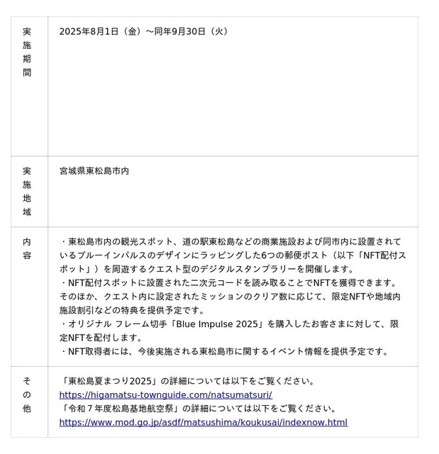 この度、オリジナル フレーム切手「Blue Impulse 2025」の発行に合わせ、東松島市制施行20周年を記念した東松島市との新たな観光体験プロジェクトを2025年8月1日(金)から実施します。