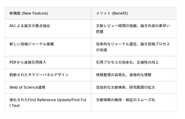 これらの新機能の導入により、研究者は文献管理の煩雑さから解放され、より創造的で本質的な研究活動に集中できるようになります。