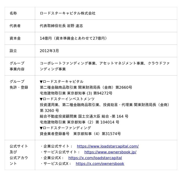 ロードスターキャピタル株式会社(本社:東京都中央区、代表取締役社長:岩野達志、東証プライム・3482)の子会社であるロードスターインベストメンツ株式会社(本社:東京都中央区、代表取締役社長:久保直之)は、不動産特化型クラウドファンディング『OwnersBook(オーナーズブック)』に関し、2025年8月1日より新たにステータス制度を導入する運びとなりましたのでお知らせします。