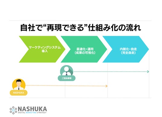 「コンサルや広告代理店のトラブルで3度乗り換えたが、NASHUKAの支援で、専門家に頼らず自分たちだけでもマーケティングできるようになった。お客様の数も売上も増え、今まで彼らが出せなかった結果を自分たちで出せた。」