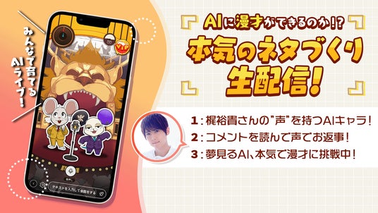 AIキャラクター「チュン太」(白ネズミ)とともに、視聴者コメントを取り入れながら“漫才のネタづくり”に挑戦。リアルタイムで寄せられるコメントをもとに、SOYOGIとチュン太が漫才ネタを構築していく参加型の生配信です。