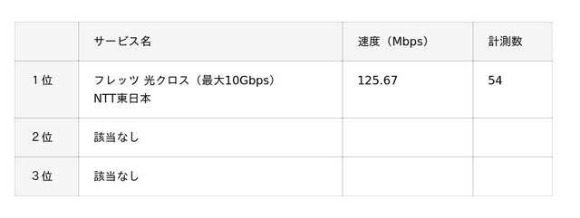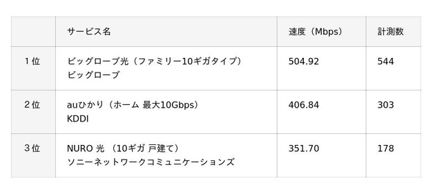 最も高い平均速度を示したのは「ビッグローブ光(ファミリー10ギガタイプ)」で、記録値は501.01 Mbpsとなり、前回に引き続き2ヵ月連続で1位を獲得しました。2位は「eo光(シンプルプラン 戸建て 10ギガコース)」の451.75Mbpsで、3位には「フレッツ 光クロス(ファミリータイプ 最大10Gbps)」(NTT西日本)が446.14Mbpsで入り、5月時点から大幅に順位を上げています。