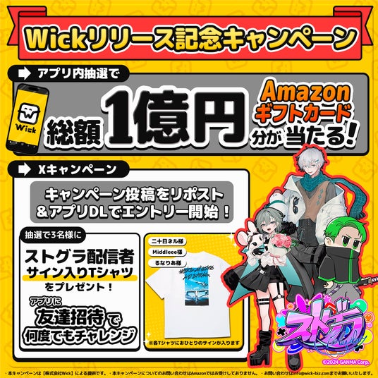 株式会社Wickは、2025年7月25日(金)19:00より 大手出版社の漫画も、最新話まで実質無料で読めるアプリ“Wick”のリリースを記念して、ストグラ配信者のサイン入りTシャツが当たるキャンペーンを開催します。
