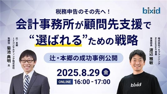 経営判断の“次の一手”を加速させる経営支援クラウド『bixid(ビサイド)』を提供する株式会社YKプランニング(本社:山口県防府市、代表取締役社長:岡本 辰徳)は、辻・本郷ITコンサルティング株式会社(本社:東京都渋谷区、代表取締役社長:黒仁田 健)との共催で、会計事務所向けに「税務申告のその先へ!会計事務所が顧問先支援で“選ばれる”ための戦略」セミナーを8月29日(金)16時よりオンライン開催いたします。