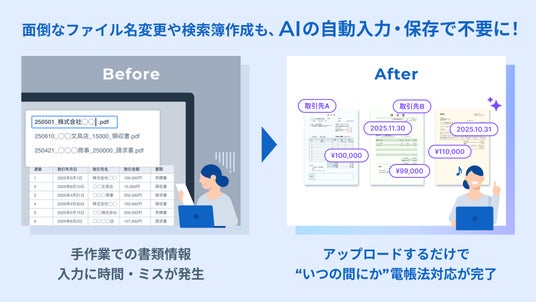 ペーパーレスにより今までの煩雑な業務から解放されるだけでなく、"いつの間にか”電子帳簿保存法への対応も完了する運用を実現します。