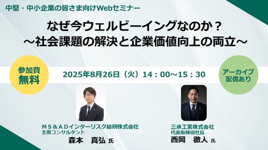 三井住友海上火災保険株式会社(取締役社長:舩曵 真一郎)とMS&ADインターリスク総研株式会社(取締役社長:宮岡 拓洋)は、SUNSHOW GROUP 三承工業株式会社(代表取締役:西岡 徹人氏)をゲストにお招きして、全国の企業を対象としたオンラインセミナー「なぜ今ウェルビーイングなのか?~社会課題の解決と企業価値向上の両立~」を8月26日(火)に開催します。