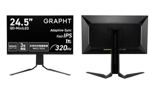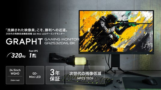 この度、毎日の当たり前をアップデートする『GRAPHT STANDARD』シリーズより、次世代の残像低減機能を搭載したQD-Mini LEDパネル採用、リフレッシュレート320Hzの、FPS/TPSなどの競技性の高いゲームでの優位性を大きく追求したゲーミングモニター『Gaming Monitor(GR2532DML-BK)』を2025年7月31日(木)に発売いたします。発売に先駆け、本日7月25日よりGRAPHT OFFICIAL STORE(ECサイト)および全国の家電量販店、PC専門店等にて先行予約販売を開始いたしました。