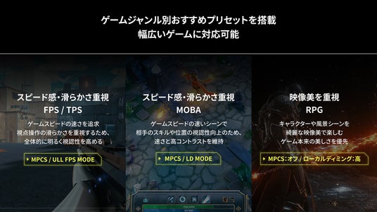 「MPCS TECH」機能のプリセットモードを選択することで、幅広いゲームジャンルに対応。ゲームの特性にあわせた楽しみ方が可能です。
