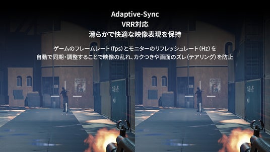 「Adaptive-Sync」および「可変リフレッシュレート(VRR)」に対応。ゲームのフレームレート(fps)とモニターのリフレッシュレート(Hz)を自動で同期・調整することで、画面内のズレ(テアリング)やカクつきを防止します。これにより、高速映像でも滑らかで快適な描画を維持。より没入感のある映像体験を提供します。
