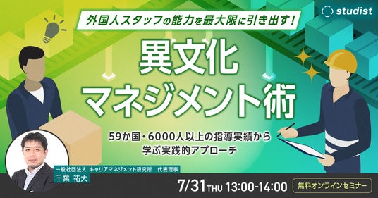 企業のオペレーション改革を支援する株式会社スタディスト(本社:東京都千代田区、代表取締役CEO:鈴木悟史、以下「スタディスト」)は、外国人労働者との効果的なコミュニケーションとマネジメント手法を学ぶオンラインセミナーを7月31日(木)に開催いたします。59か国・延べ6000人以上の外国人材を指導してきた豊富な実績を持つ千葉祐大氏が、異文化マネジメントの本質と実践的な解決策をお伝えします。