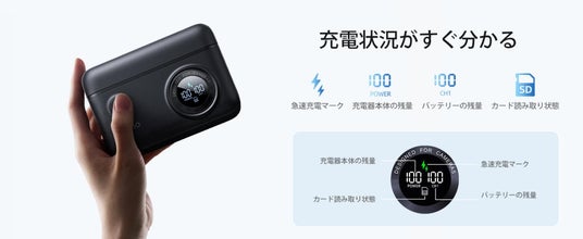 充電器本体のバッテリー残量、カメラバッテリーの残量を確認できるディスプレイ機能を搭載。ボタンを押すだけでカメラバッテリー残量がすぐ分かりますので、カメラにバッテリーを装着して残量を確認する手間が省けます。