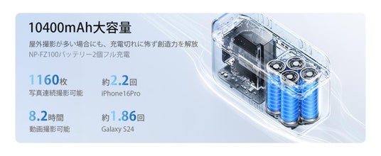 10400mAhのバッテリーを搭載するCS2PROカメラ充電器はNP-FZ100バッテリー(2280mAh)を約2回、iPhone 15 Proを約2回、Galaxy S24を約1.6回充電することができます。外出先でも安心!モバイルデバイスとカメラバッテリーの一日分の電力をしっかりサポート。残量の不安にさようなら!