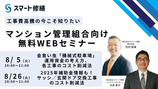 マンションやビルなど大型建物の修繕工事の見積、工事支援サービスを展開する株式会社スマート修繕(本社:東京都港区)は、マンション区分所有者様を対象にした無料のWebセミナーを開催します。