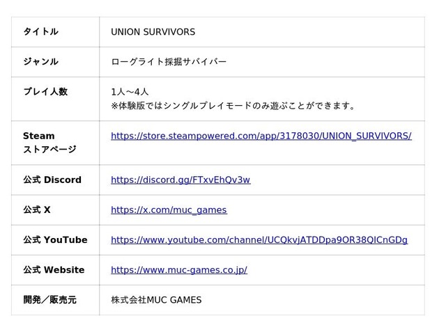 株式会社MUC GAMES(ムックゲームス)(東京都世田谷区、代表取締役社長:粟村 隆一)は、本日(7月25日)より、ローグライト採掘サバイバー『UNION SURVIVORS』の体験版(DEMO版)を「Steam」にて配信したことをお知らせいたします。