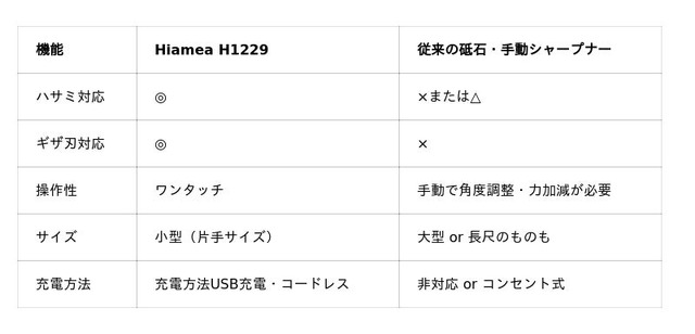 H1229は、包丁・ハサミ・パン切り包丁・狩猟ナイフなど様々な刃物に対応した、USB充電式のコンパクト電動シャープナーです。従来の砥石や手動シャープナーでは難しかった「ギザ刃」「ハサミ」もわずか数秒で蘇る、まさに “手のひらサイズの切れ味職人”。