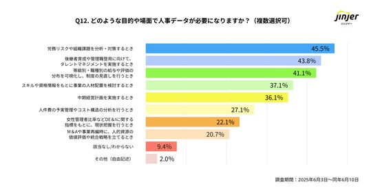 人事担当者(Q12)がどのような目的や場面で人事データが必要になると感じているかを質問したところ、日常的な業務効率化から、より戦略的な人材マネジメントまで、幅広いニーズが浮き彫りになりました。