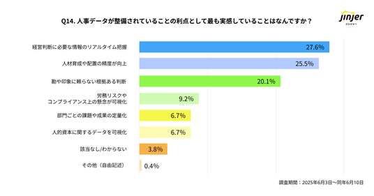 一方、経営層(Q14)が最も実感している利点は、「経営判断に必要な情報のリアルタイム把握」で27.6%でした。次いで「人材育成や配置の精度が向上(25.5%)」、「勘や印象に頼らない根拠ある判断(20.1%)」が挙げられました。