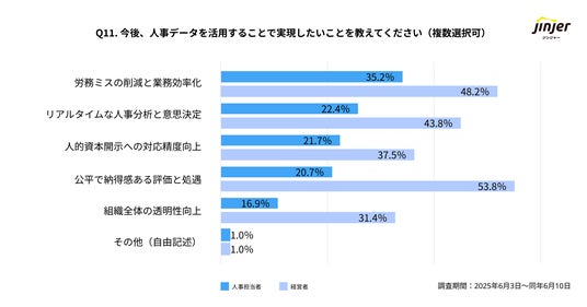 この結果は、人事担当者が日々の実務における効率化や正確性の向上を重視しているのに対し、経営層は正しい人事データの活用による経営判断や戦略的な人材マネジメントへの貢献をより期待しているという、それぞれの立場からの認識の違いを示しています。