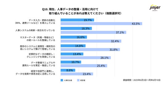 人事データの整備・活用に向けた現在の取り組みについて尋ねたところ、ここでも経営層と人事担当者の間で認識に大きな差が見られました。