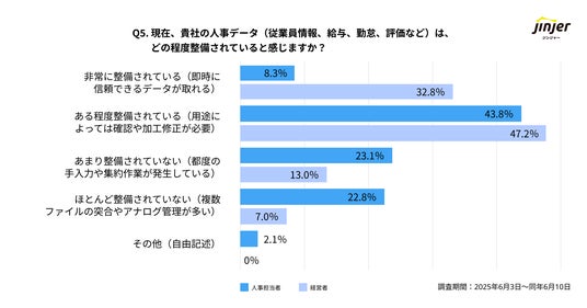「人事データ(従業員情報、給与、勤怠、評価など)がどの程度整備されていると感じているか」という質問をしたところ、「非常に整備されている」と回答した割合は、経営者が32.8%であったのに対し、人事担当者は8.3%と、約4倍の開きが見られました。