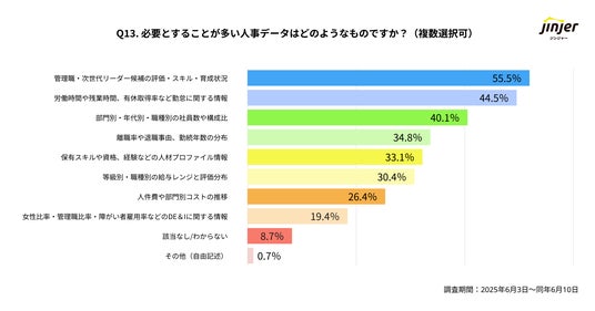 経営層(Q13)が「必要とすることが多い人事データ」として最も重視しているのは、「管理職・次世代リーダー候補の評価・スキル・育成状況」で55.5%と半数を超えました。これは、企業の将来を担う人材の把握と育成が、経営層にとって喫緊の課題であることを強く示唆していると言えます。