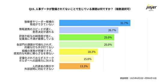 経営層(Q15)が最も懸念している課題は「後継者やリーダー候補の育成ができていない(31.7%)」でした。次いで、「情報連携のスピードが遅く、意思決定が遅れる(26.7%)」、そして「評価や給与の納得度が低く、従業員に不満が蓄積している」と「各部門の課題が可視化されず、的確な打ち手が打てない」(いずれも25.0%)が続きました。これは、経営層が人事データの未整備によって、経営戦略や組織の人材基盤に関わる上位の課題に直面していることを示唆しています。