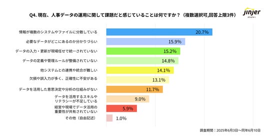 一方、人事担当者(Q4)が最も課題だと感じているのは、「情報が複数のシステムやファイルに分散している(20.7%)」でした。これに「必要なデータがどこにあるのか分かりづらい(15.9%)」、「データの入力・更新が現場任せで統一されていない(15.2%)」が続きます。これらの結果は、現場の人事担当者が日々の業務におけるデータ管理の煩雑さや非効率性に直接的に悩まされている現状を浮き彫りにしています。