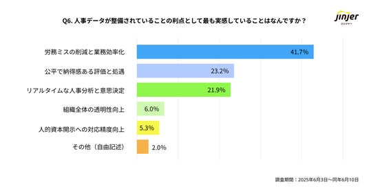 人事担当者(Q6)が最も実感している利点は、「労務ミスの削減と業務効率化」で41.7%と突出しています。次いで「公平で納得感ある評価と処遇(23.2%)」、「リアルタイムな人事分析と意思決定(21.9%)」が続きました。