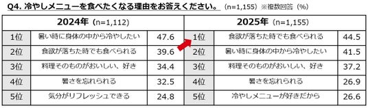 ・食べたくなる理由は「食欲が落ちたときでも食べられる」が最も高く、次いで「暑い時に身体の中から冷やしたいから」。