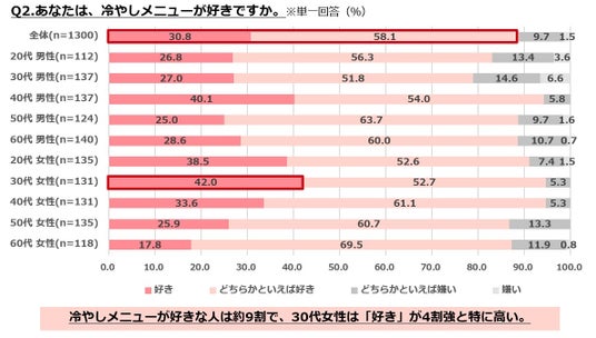 ・冷やしメニューが好きな人は約9割で、30代女性は「好き」が4割強と特に高い。