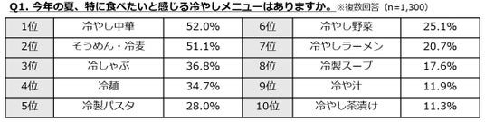 ・今夏に食べたい冷やしメニューは、「冷やし中華」が「そうめん・冷麦」を僅差で上回りトップ。