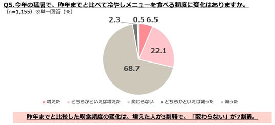 それにしてもこの暑さ、冷やしメニューの食べ方が変化しているという方が今回は6割強でしたが、今後どのように変化するか注目しておく必要がありそうです。