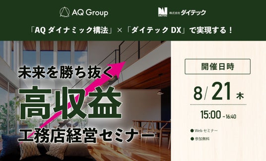 株式会社ダイテック(本社:東京都品川区、代表取締役社長:野村明憲、以下ダイテック)と株式会社AQ Group(本社:埼玉県さいたま市、代表取締役兼社長執行役員:加藤博昭、以下AQ Group)は、住宅業界で活躍されている皆さまを対象に、共催セミナー「未来を勝ち抜く高収益工務店経営セミナー」を2025年8月21日(木)にオンラインで開催します。